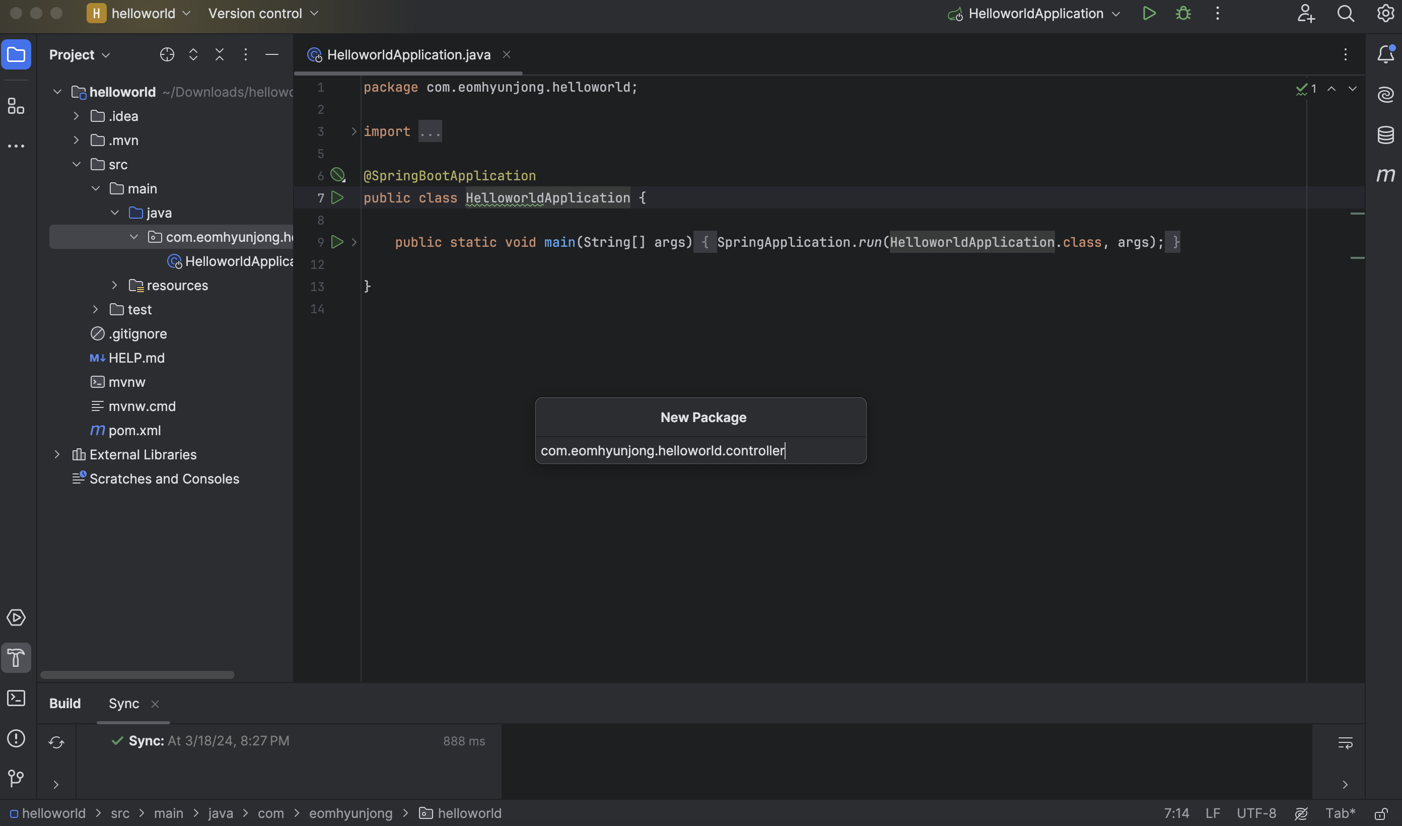 하위 Package에 새로운 자바 클래스 HelloWorldController를 생성 해줍니다.