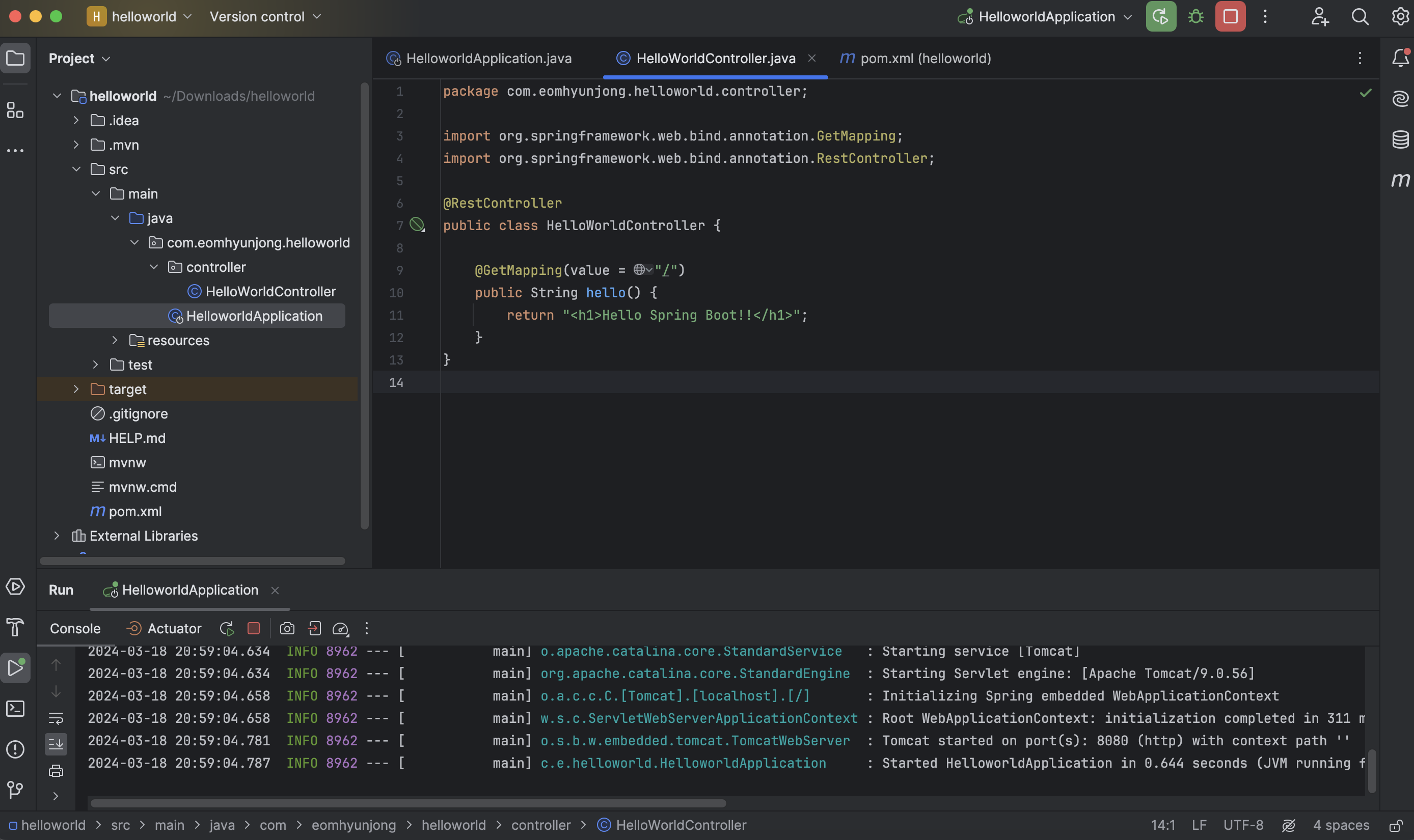 HelloWorldController에 다음과 같이 메서드 생성 후 ,