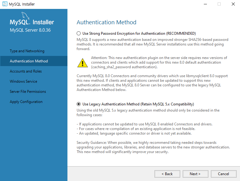 Use Legacy Authentication Method를 선택 후 [Next] 버튼을 클릭합니다.
