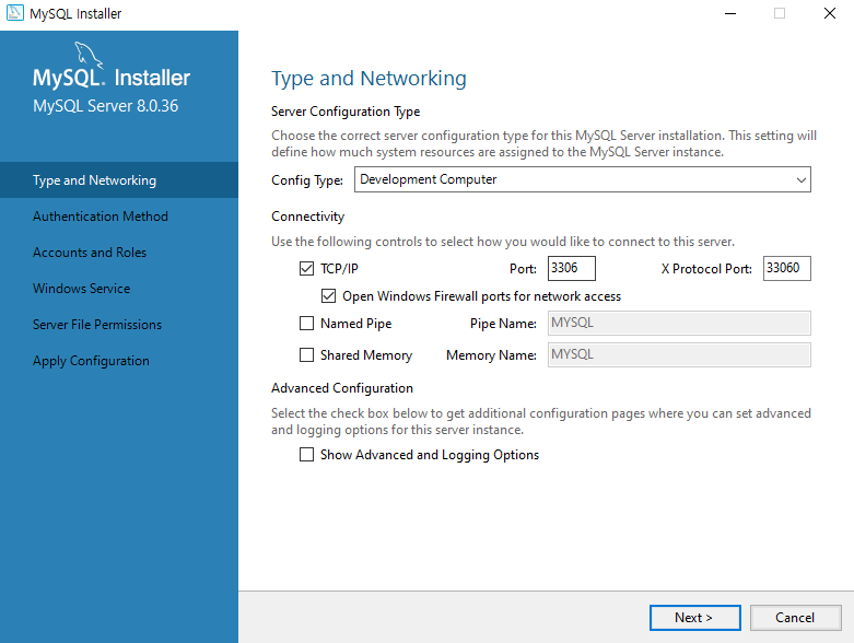 [Windows Service] 에서는 MySQL 서버를 윈도우즈의 서비스로 등록하기 위한 설정을 진행합니다.