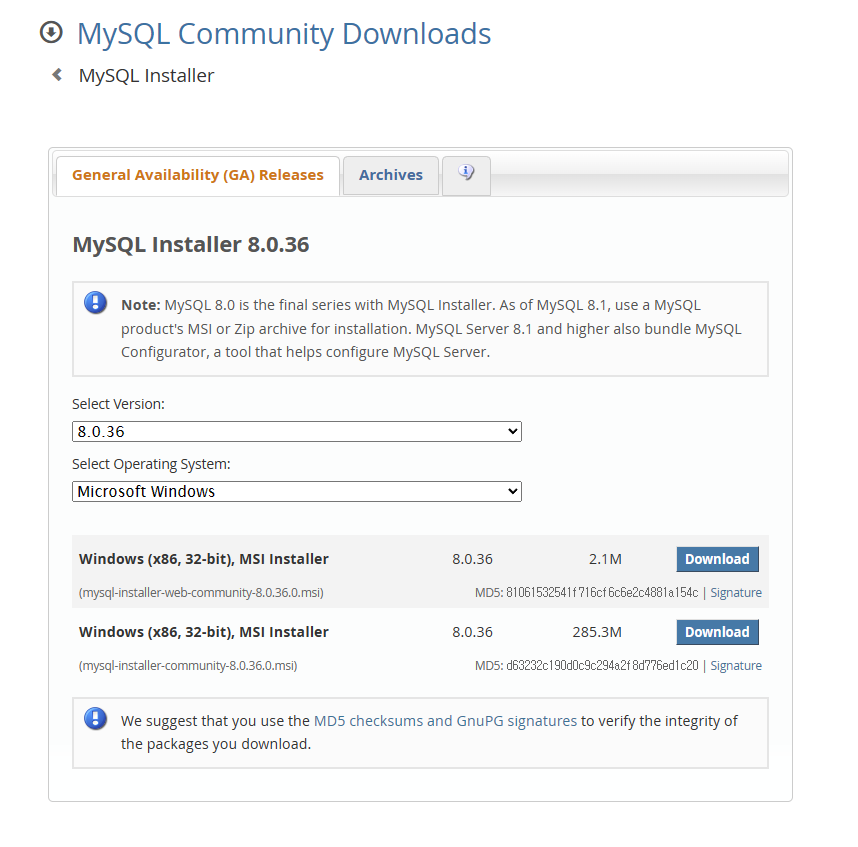 Note: MySQL 8.0 is the final series with MySQL Installer. As of MySQL 8.1, use a MySQL product's MSI or Zip archive for installation. MySQL Server 8.1 and higher also bundle MySQL Configurator, a tool that helps configure MySQL Server.
